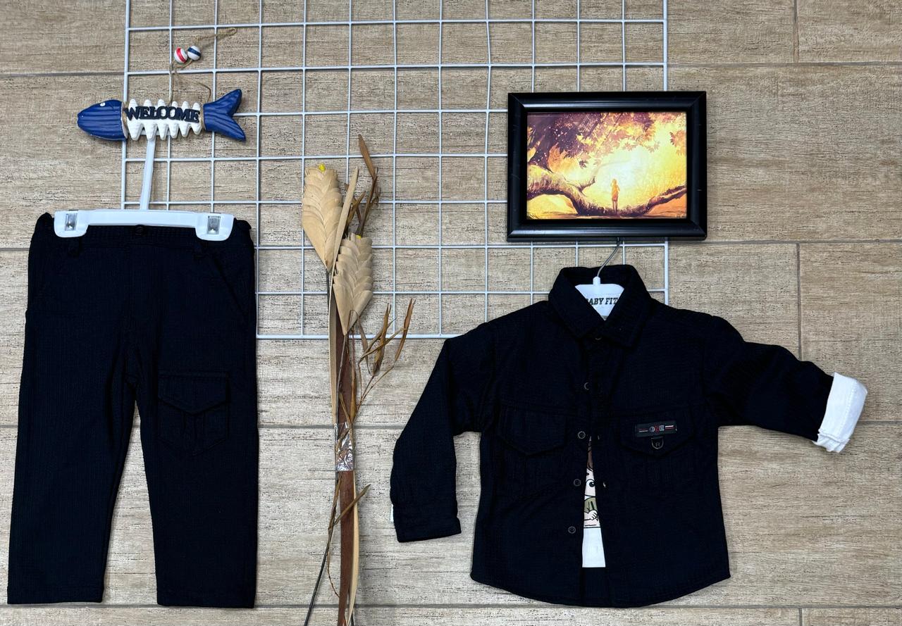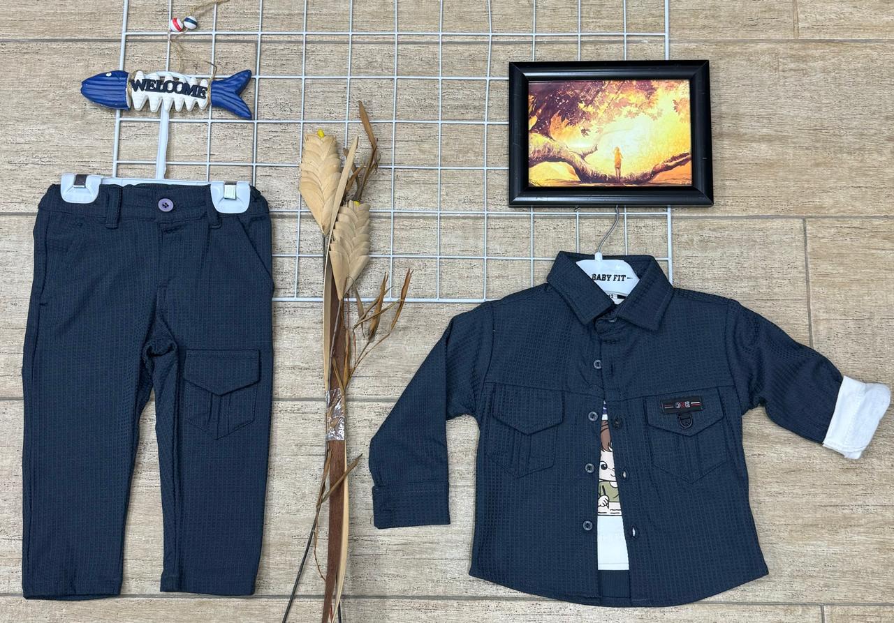 This tiny ensemble radiates sweet elegance,crafted in a soft, the set includes slim-fit pants with a gently buttoned waistband, accented by a charming pocket detail on one leg. Paired with a collared button-down shirt, the look is both classic and playful, with little foldable cuffs and two flap chest pockets that echo the pants’ design.