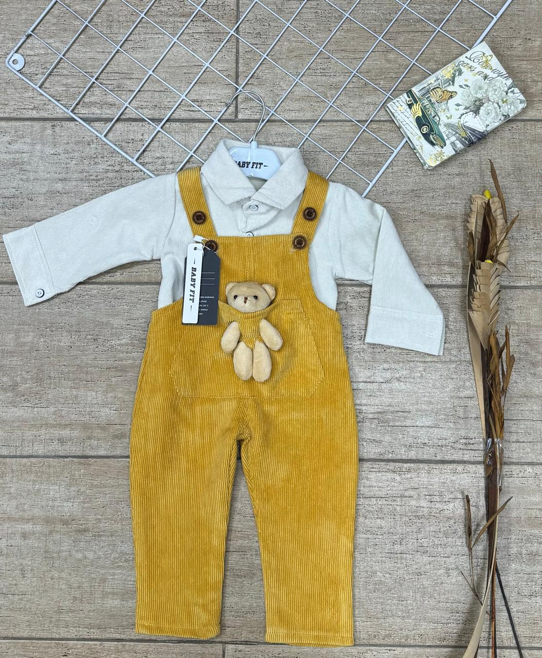 This adorable baby outfit pairs a crisp white long-sleeve shirt (likely soft and comfortable) with a mustard-yellow corduroy romper. The romper features adjustable shoulder straps secured by buttons, a charming teddy bear plush affixed to the front pocket, and full coverage from top to toe combining warmth, texture, and whimsical...